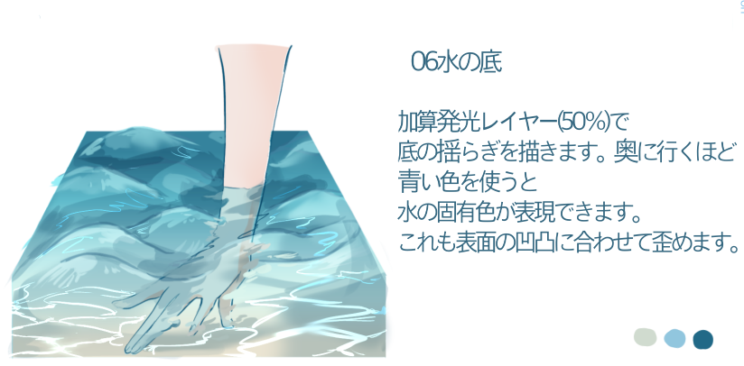 在加法发光层( 50% )中画底部的波动。 越往里走,如果使用蓝色可以表现水的固有颜色。这个也会随着表面的凹凸而变形。