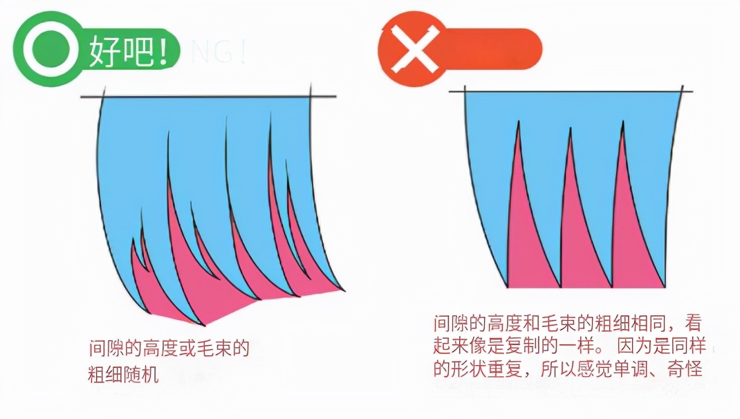 连续画头发的时候,不是重复同样的形状,而是尽量随机改变高度和粗细来画,看起来很自然。