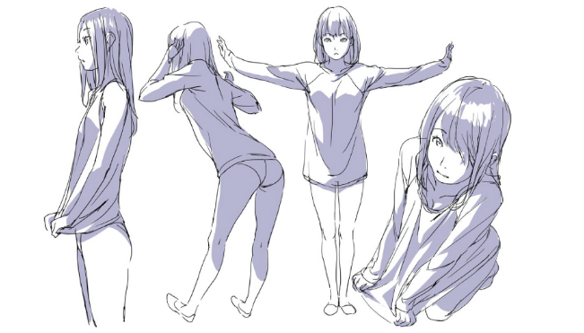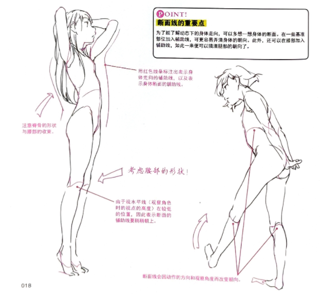 想要绘制出优美的身体线条,首先把握好身体的“走向”非常重要,其次还要具备将把握到的走向以立体方式表现出来的技巧。为此,以断面的方式考虑身体、加入辅助线等都是不错的方法。