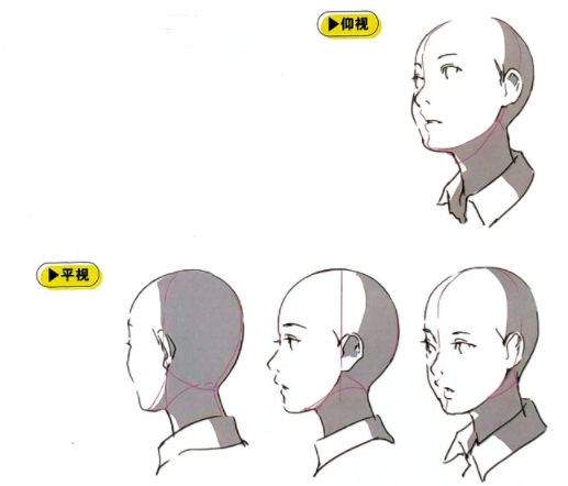 当角度变化时,眼、鼻、口、耳的位置也会发生改变。其中是为直观的是耳的位置。平视时它与眼睛处在相同高度,仰视时处于比眼睛更低的位置,而俯视则处于比眼睛更高的位置。此外眼与眼的间隔、眼与耳的间隔也会发生变化。如例图所示,不同角度下各个部位的位置都会发生变化。