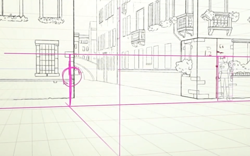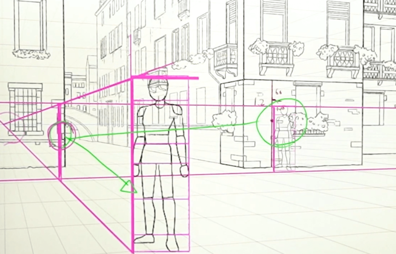 作为应用,我将使用有两个消失点的“两点透视”背景插图来介绍如何移动人。这次让右侧的人物向左移动后向前移动。