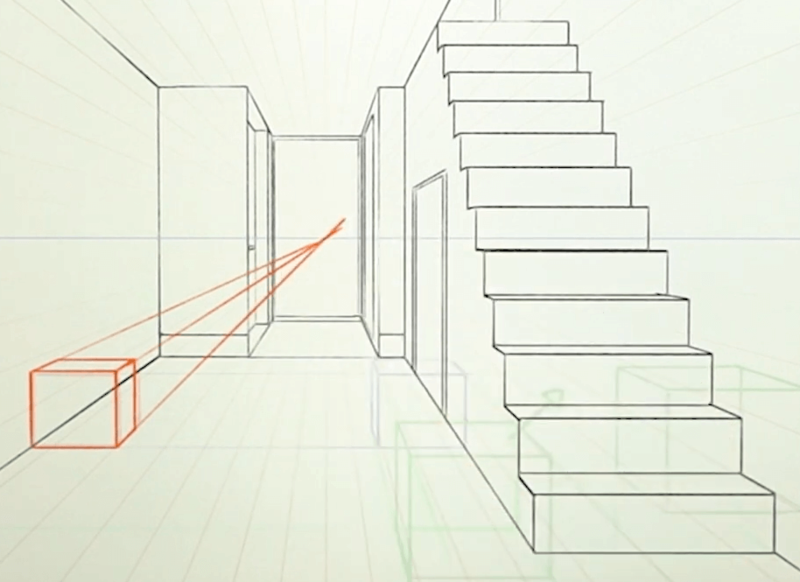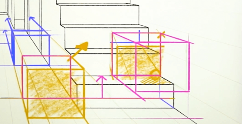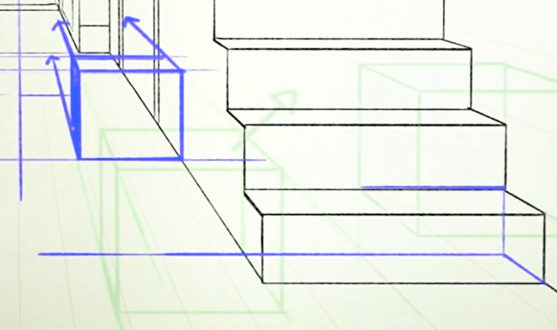 这次把“横向移动的箱子”向前移动。为了横穿楼梯的第一段,我画了楼梯的竖线和里面的底边。把楼梯的底边画成水平线,使其成为箱子的底边。