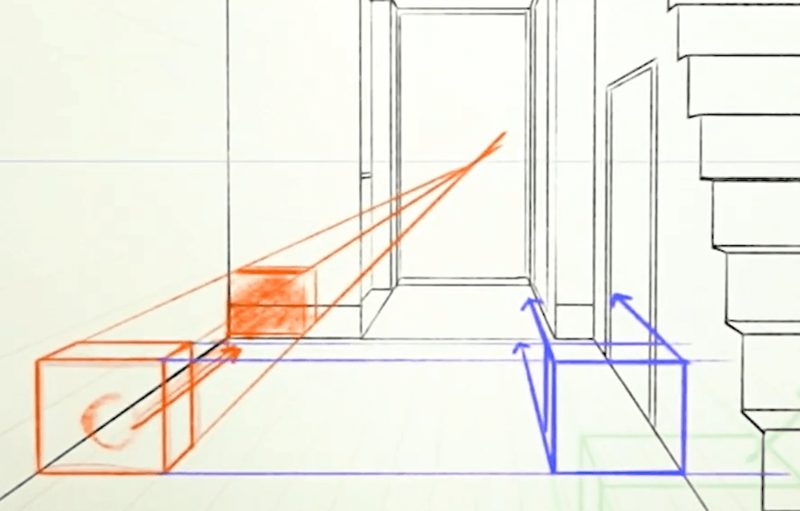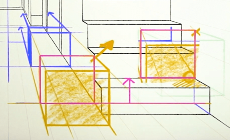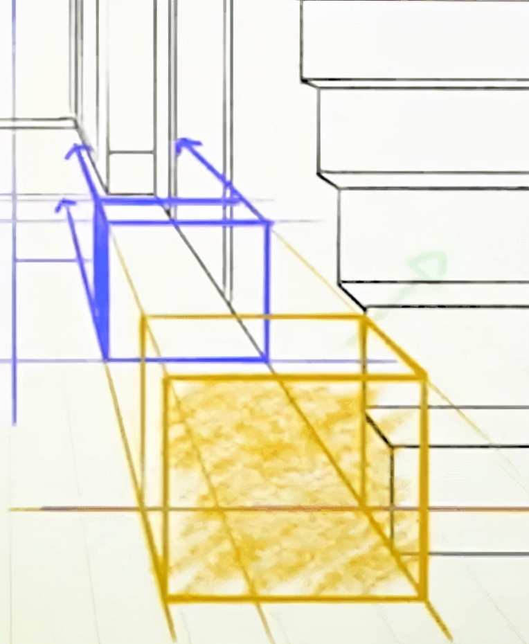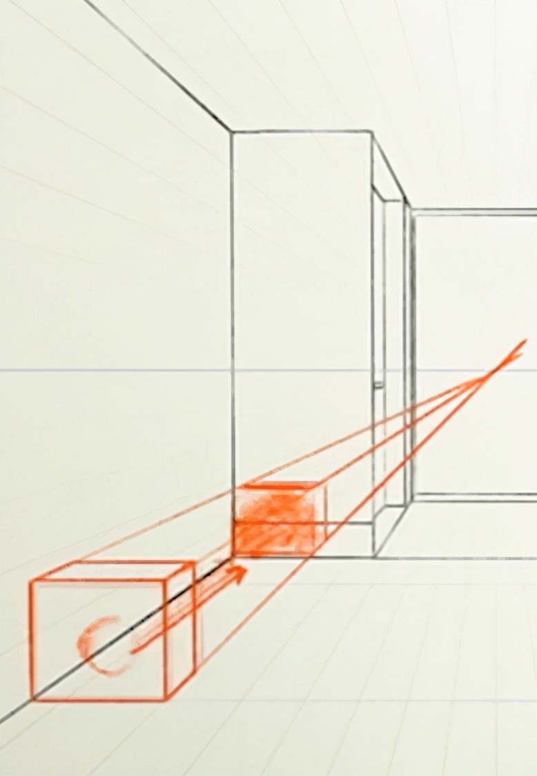其次,从“横向移动的箱子”的顶点向前拉透视,以透视为基础画出四边,完成了“向前移动的箱子”。