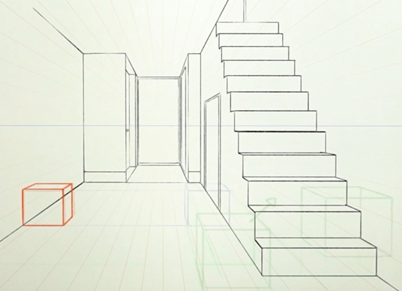 连接消失点和箱子的顶点拉透视,以透视为基础画出四边,完成“在楼梯上移动的箱子”。