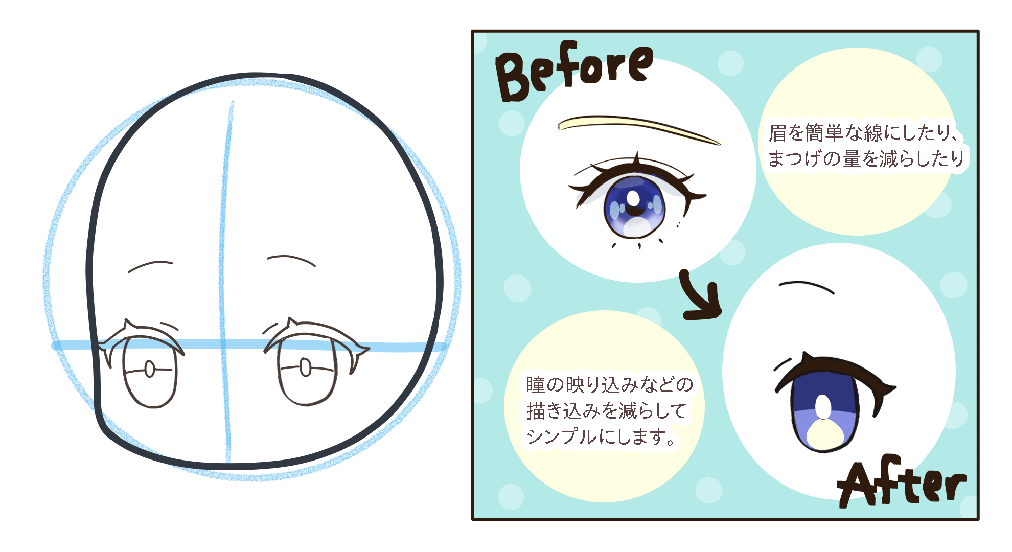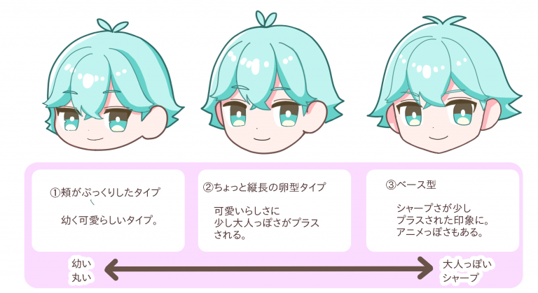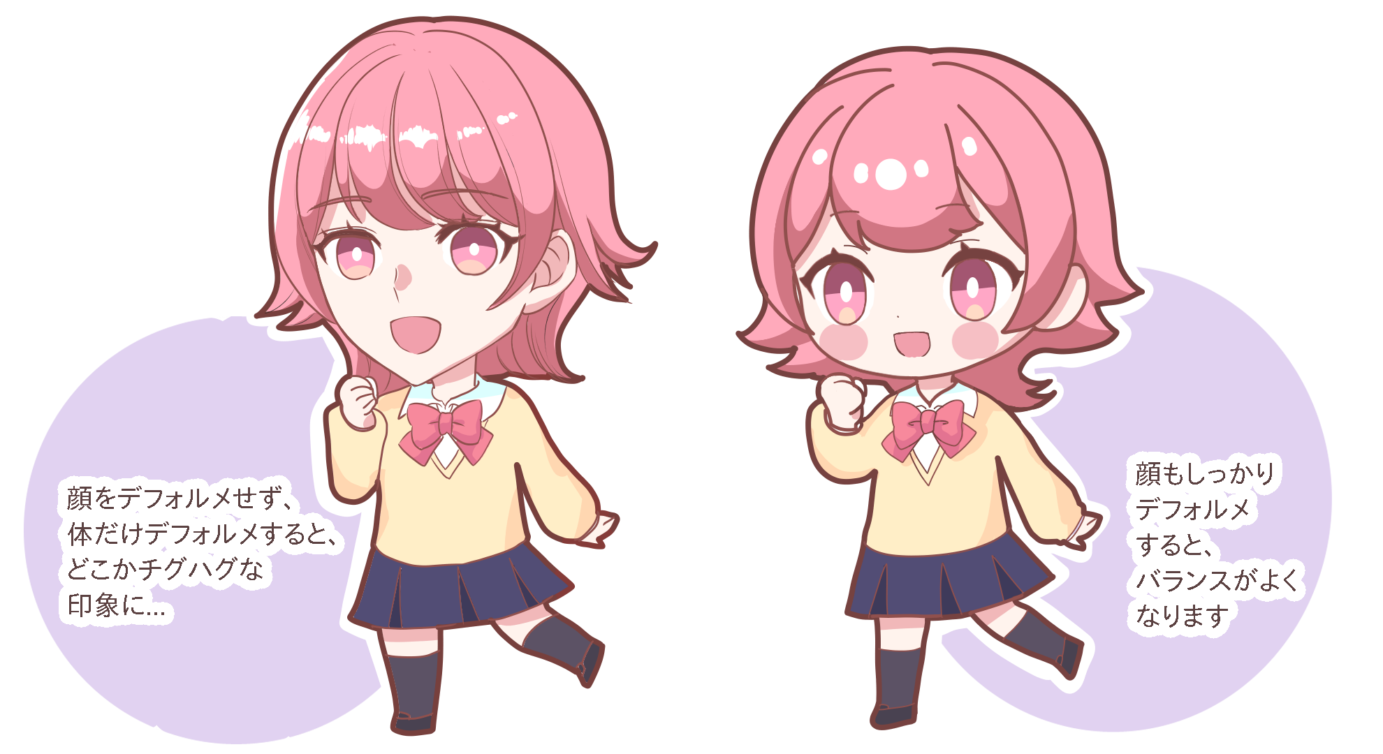 那么,一边实际画出矮小角色的脸,一边详细看看这3个要点吧。