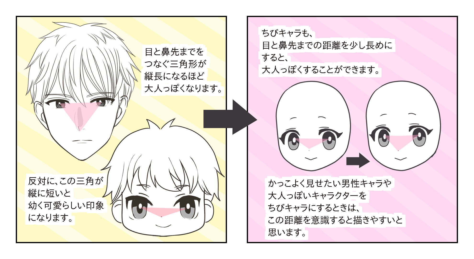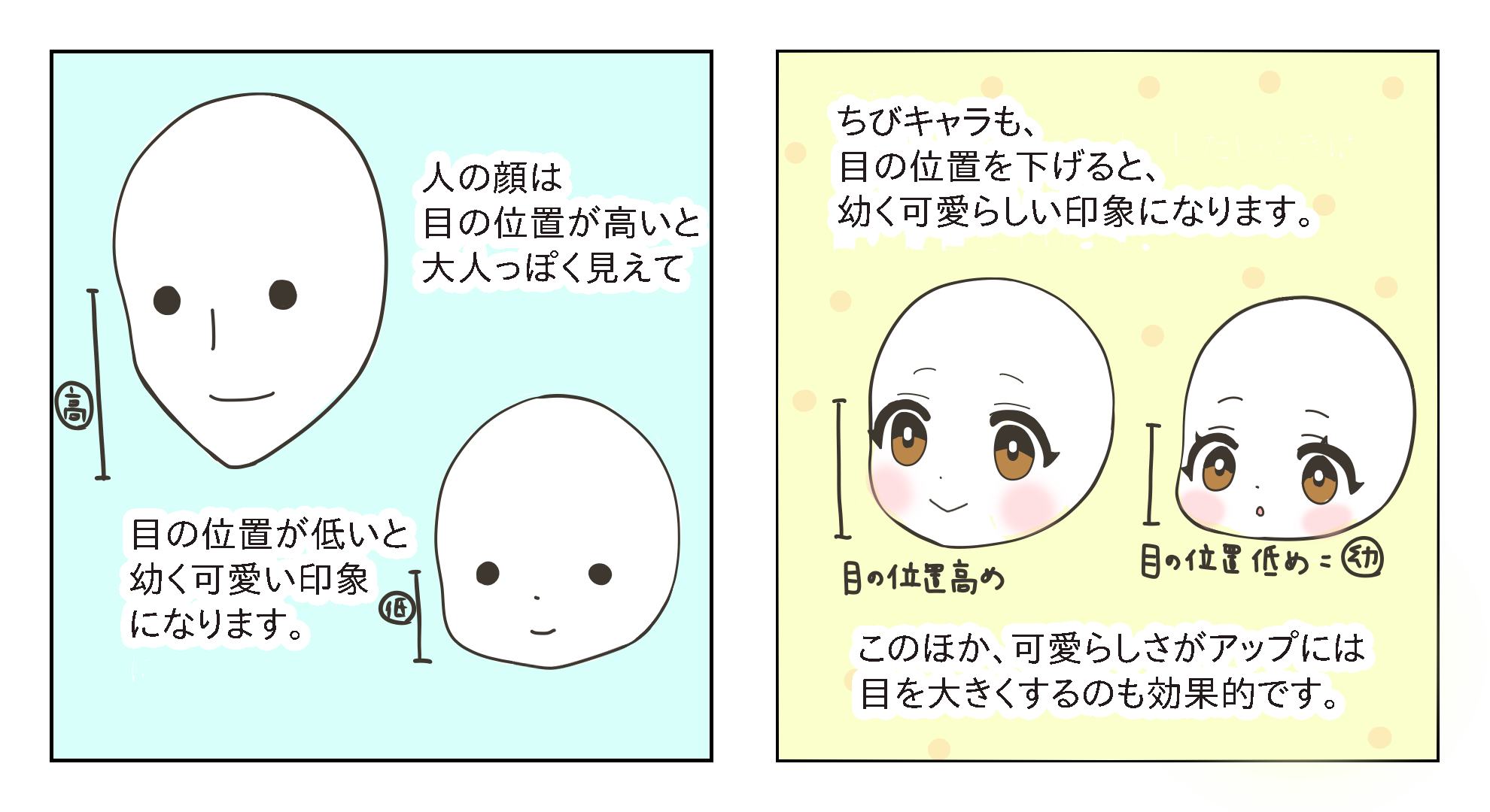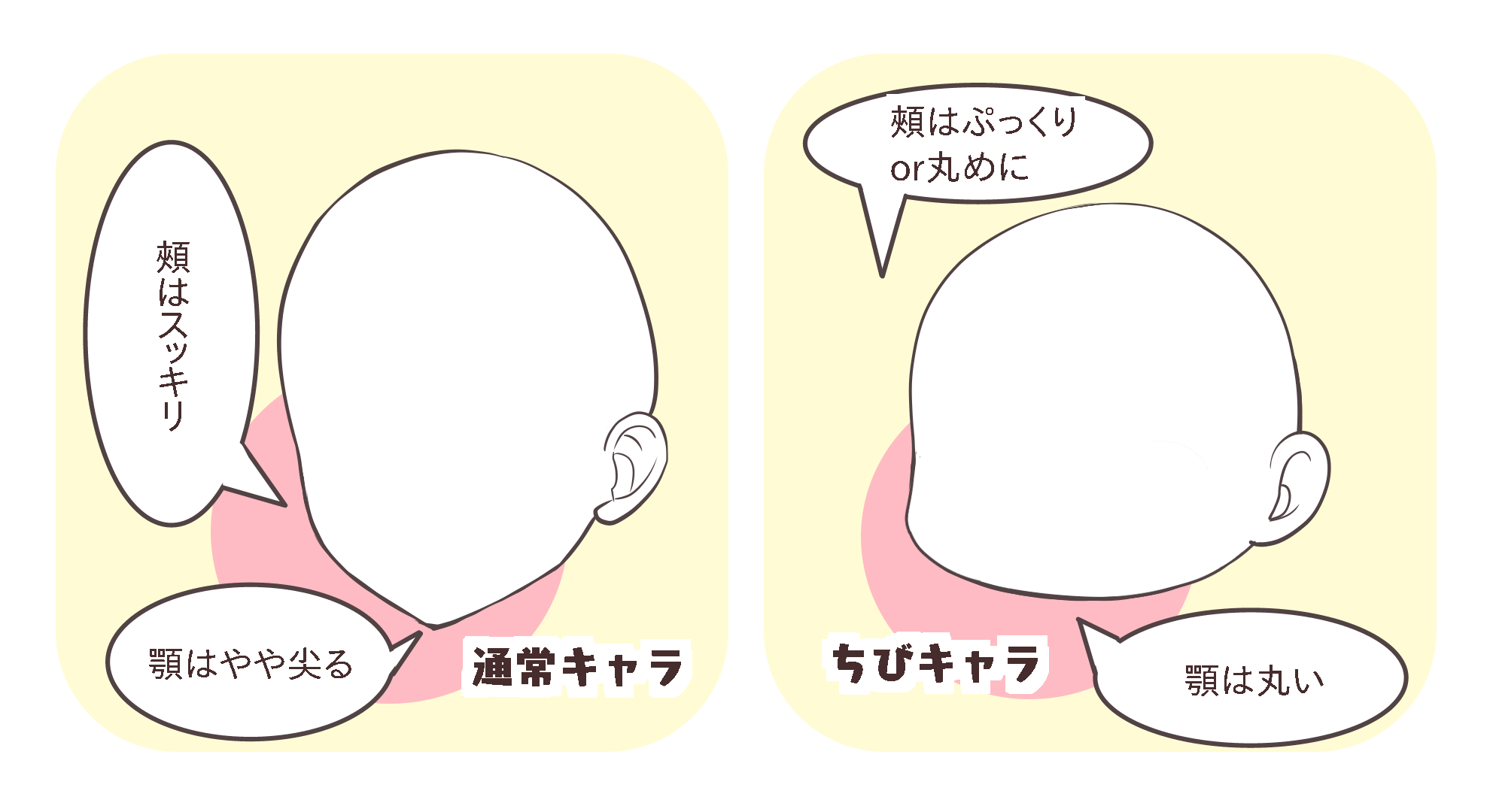 那么,一边实际画出矮小角色的脸,一边详细看看这3个要点吧。