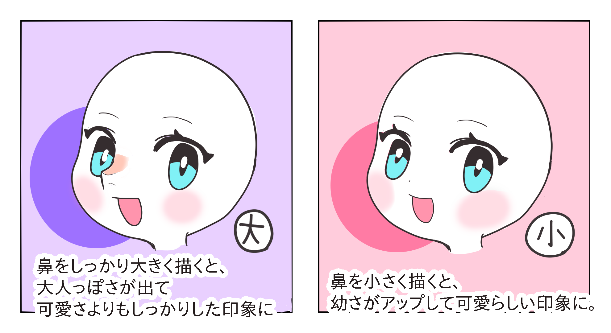 画好鼻子的话,幼小就会减少,逼真度就会展现在前面,所以在矮小角色中推荐“尽量画得小一点”或者“不画鼻子”。