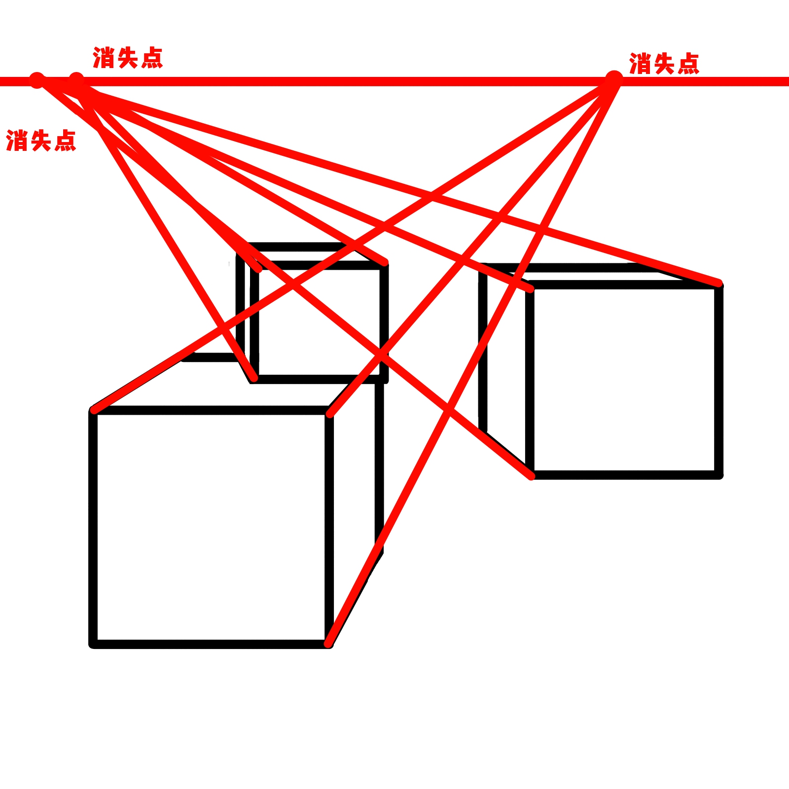 用单点透视图法绘制自然的多个立方体时的注意要点。
