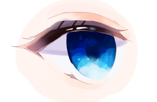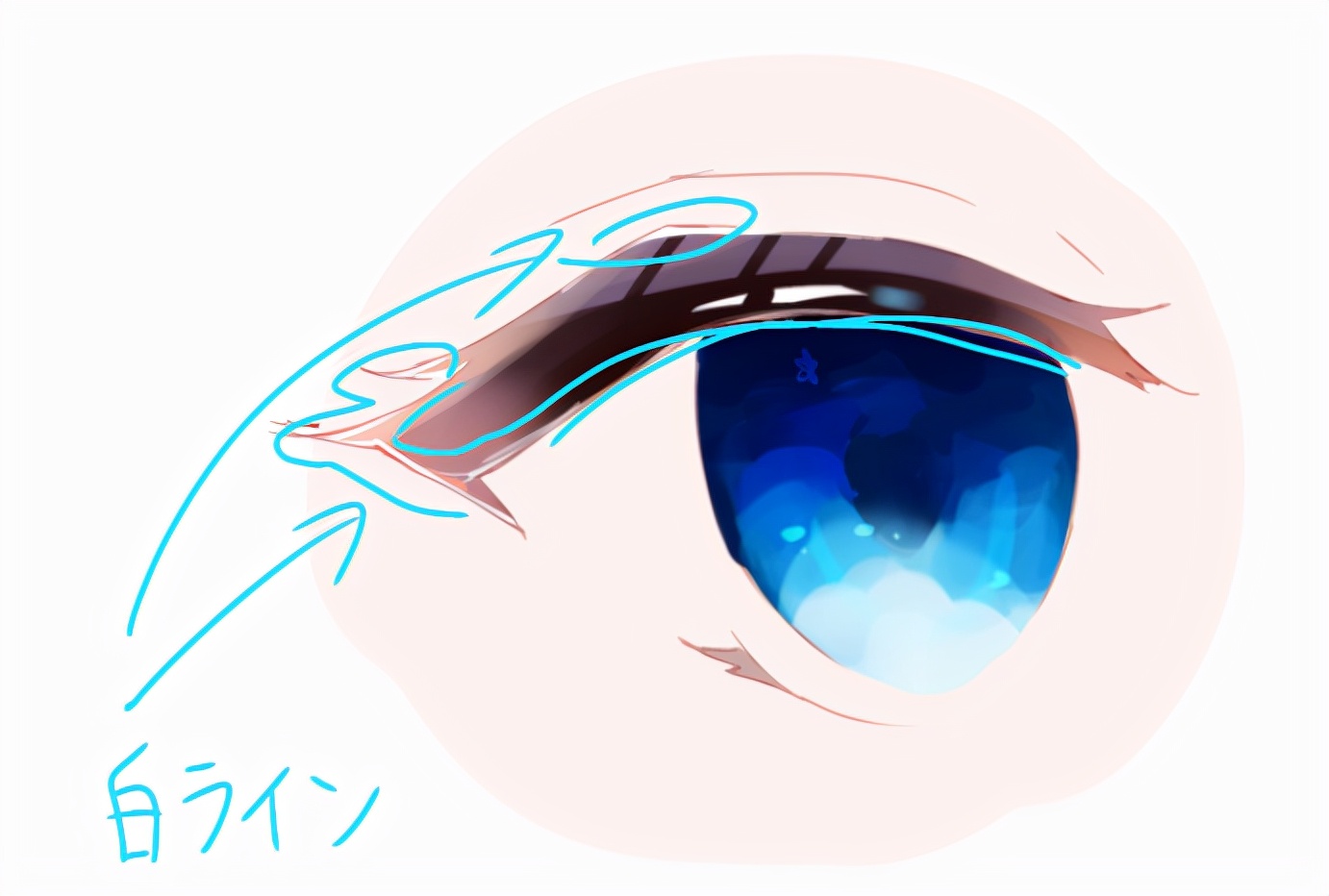 把光打在眼睛上;用紫色的网屏住上部,用橡皮擦掉。 另外,像描绘线条画一样,在下面描绘白色,描绘光的碎片