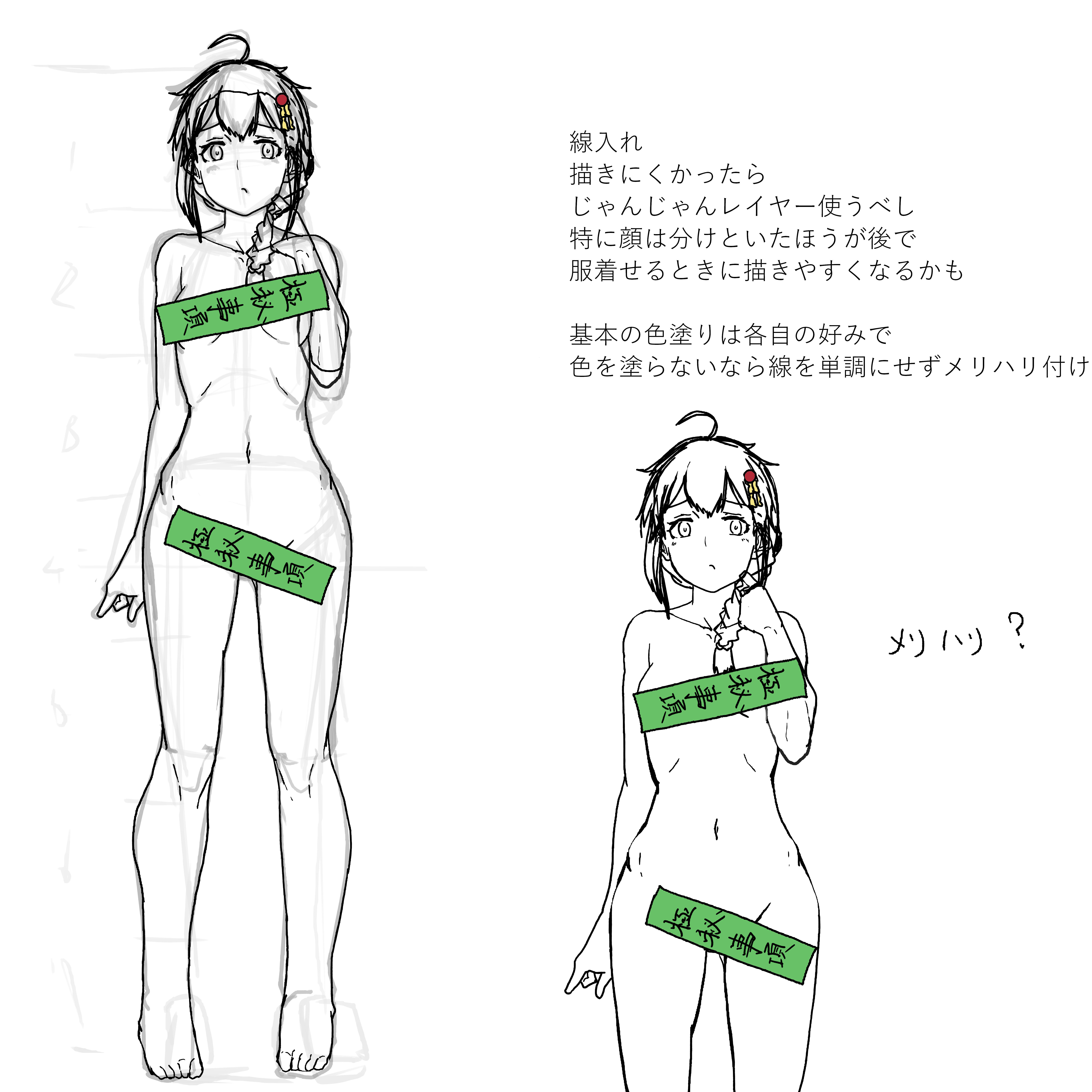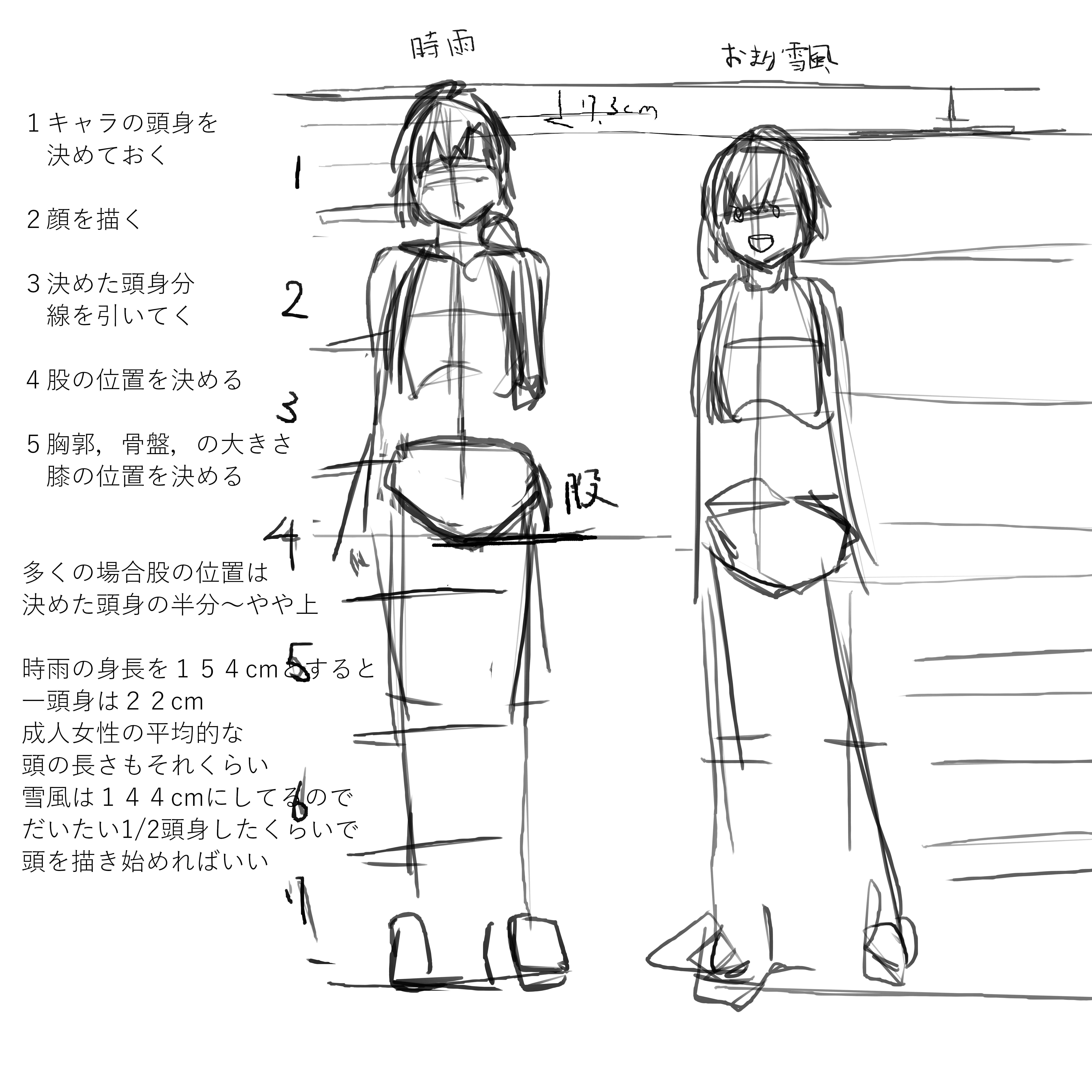 7.时雨身高154厘米,头身长2.2厘米的成年女性的平均头长也有那么多。雪风的长度是144厘米,大概只有一半左右,开始画头就可以了。