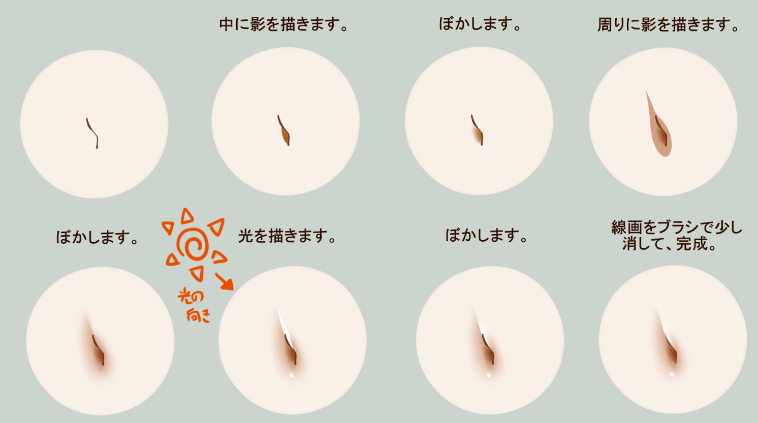 在里面画阴影。模糊。在周围画阴影。模糊。画光。模糊。用刷子擦掉线条画,完成。