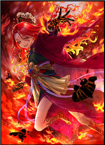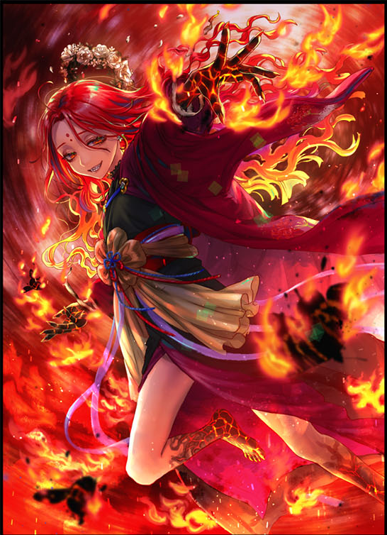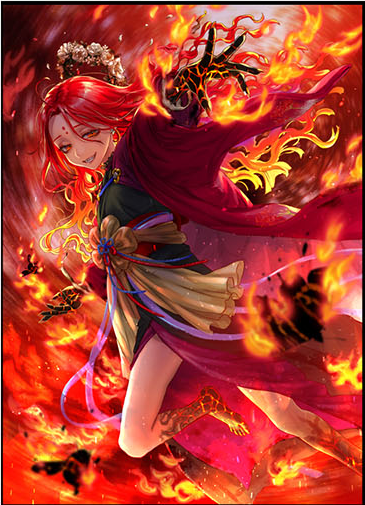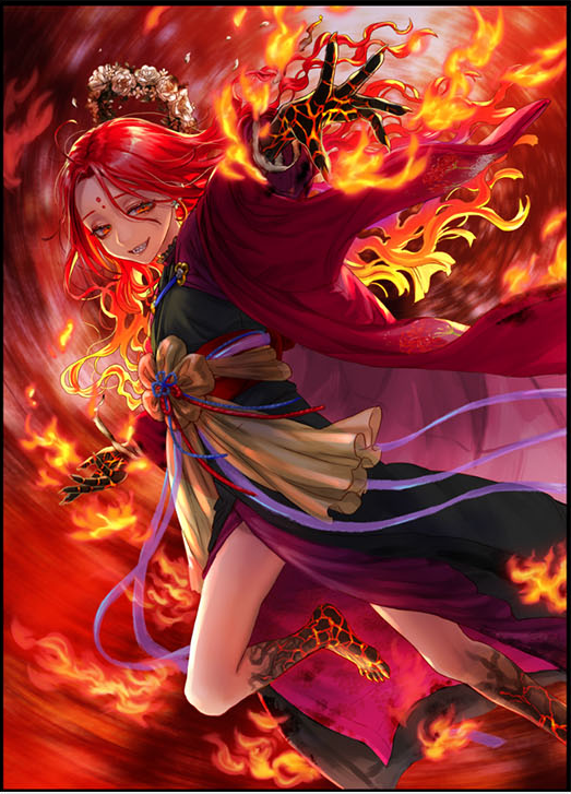 总完工。在火焰周围(手部附近)等处放入朦胧的橙光,会更加有热感。 (因为这个角色的手是黑色的,所以是多余的)和火焰完全无关,但是在做了其他的完成和描绘之后就完成了。这幅画在日光中散布着绿色。