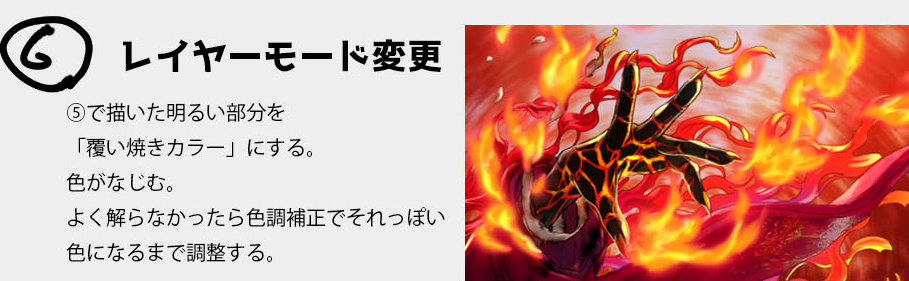 中描绘的明亮部分改为“覆盖烧色”。颜色调和。如果不太明白的话,通过色调修正调整到那种颜色为止。
