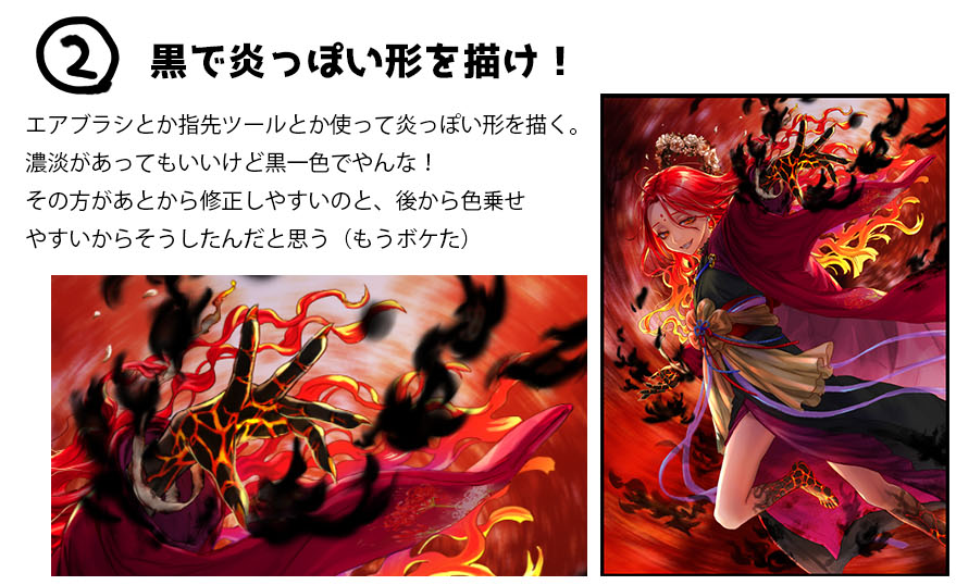 2.画出黑色的火焰形状!使用喷笔或指尖工具描绘火焰状的形状。有浓淡也可以,但一色的黑色就不行了!我想是因为之后更容易修改,之后更容易上色,所以才这样做的(已经模糊了)