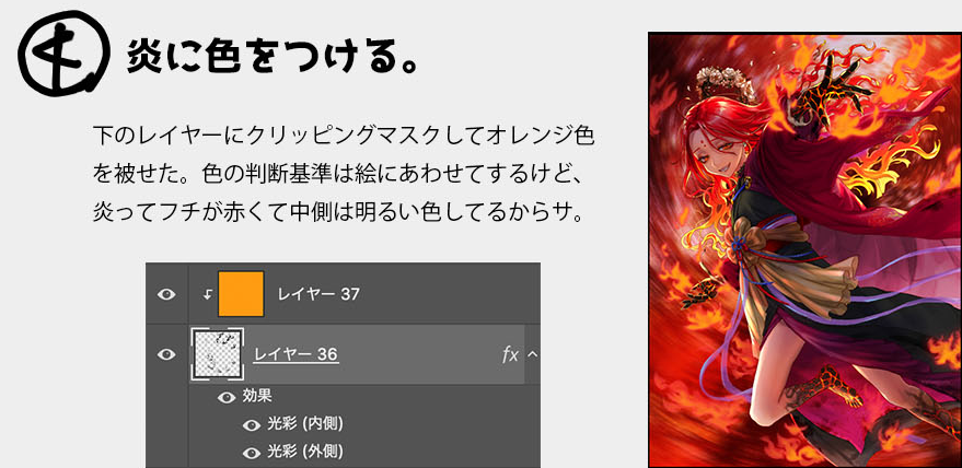 在下面的层上做了剪裁口罩,涂上了橙色。颜色的判断基准是根据画面来判断的,火焰的话是因为尾巴是红色的,中间是明亮的颜色。
