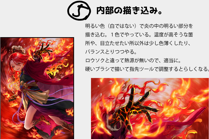 5.内部描绘。用明亮的颜色(不是白色)描绘火焰中明亮的部分。用一种颜色做。除了温度较高的地方,想突出的地方以外,要稍微变淡一些,保持平衡。和蜡烛不同没有热源,所以要适当。用硬刷子画,用指尖工具调整的话会很像。