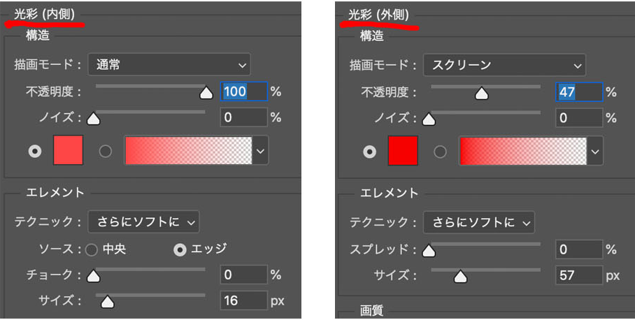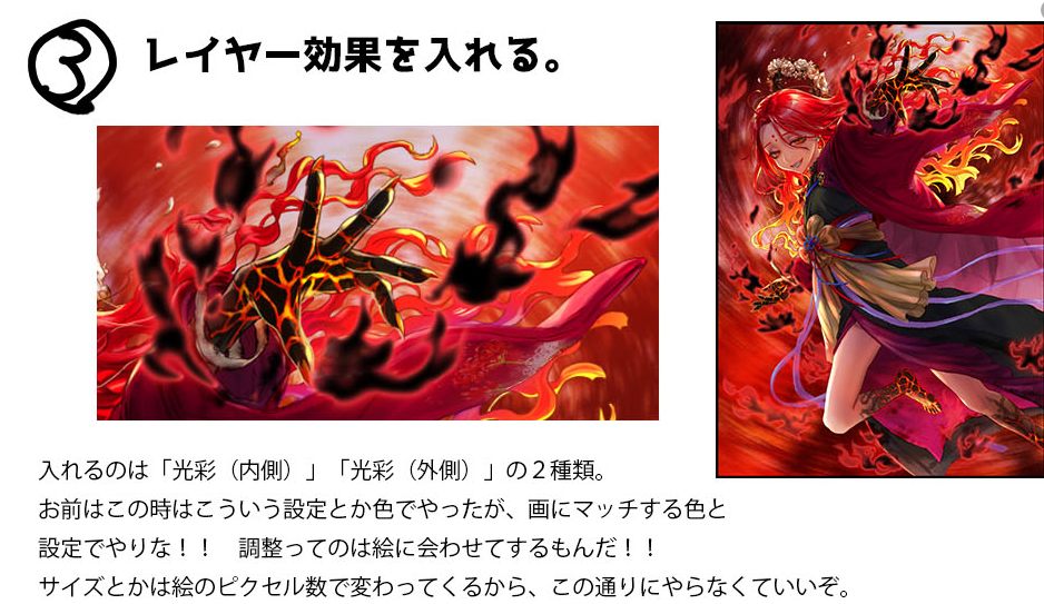 放入的有“光彩(内侧)”“光彩(外侧)”2种。你这个时候用这样的设定之类的颜色做了,但是要用和画面相符的颜色和设定来做哦! ! 调整是为了配合画! !尺寸之类的会根据画的像素数而变化,所以不用照着做。