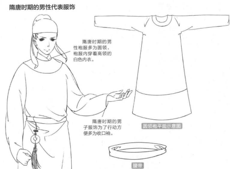 圆领窄袖袍衫为唐朝官吏的主要服饰,其颜色曾有规定:凡三品以上官员一律用紫色;五品以上,为绯色;六品、七品为绿色;八品、九品为青色。以后稍有变更。另在袍下施一道横襕,也是当时男子服饰的一大特点。