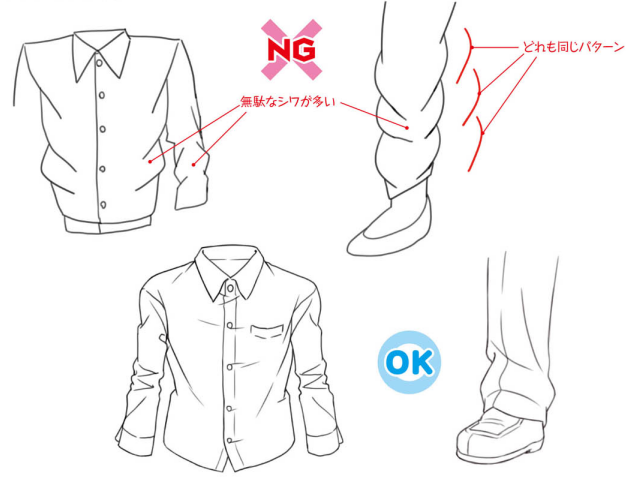 褶皱如果以相同的地方连续或相同的间隔描绘的话,会看起来像新手的画。