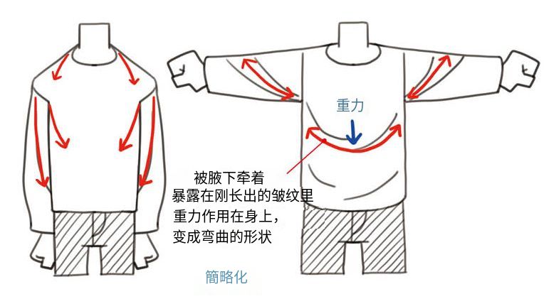 从肩的触点向下形成的皱纹是由重力引起的。