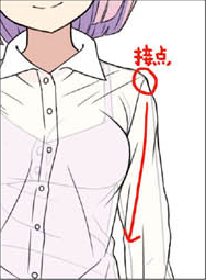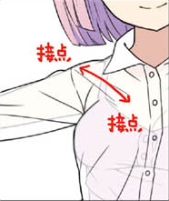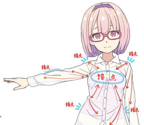 肩膀、腰、女性的话,胸部等身体和衣服接触的地方(接触点)会扯到布料,形成皱纹