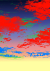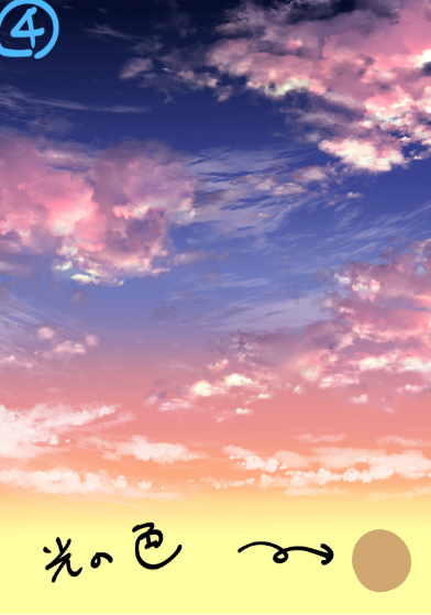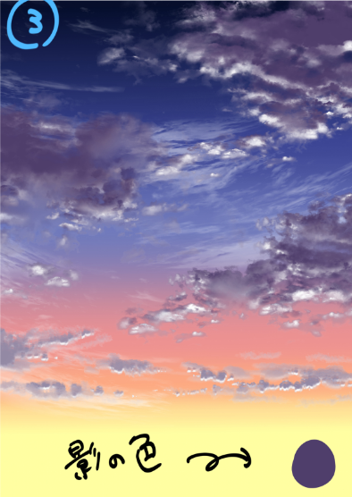放上云的影子。因为是朝霞,所以要把云的下部涂得明亮一些。下面的云很远,所以影子的颜色变淡。