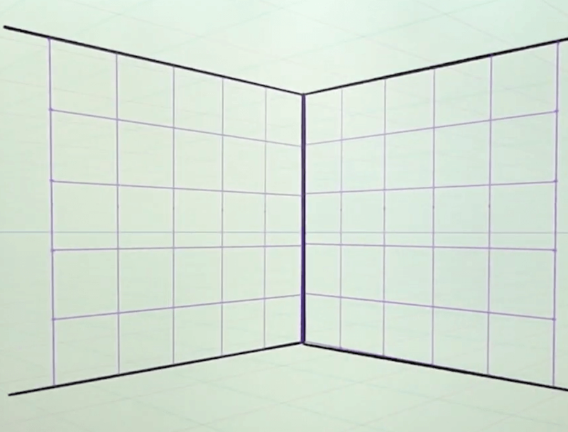 沿着两点透视的向导绘制墙线,并将准备好的网格放置在墙上。