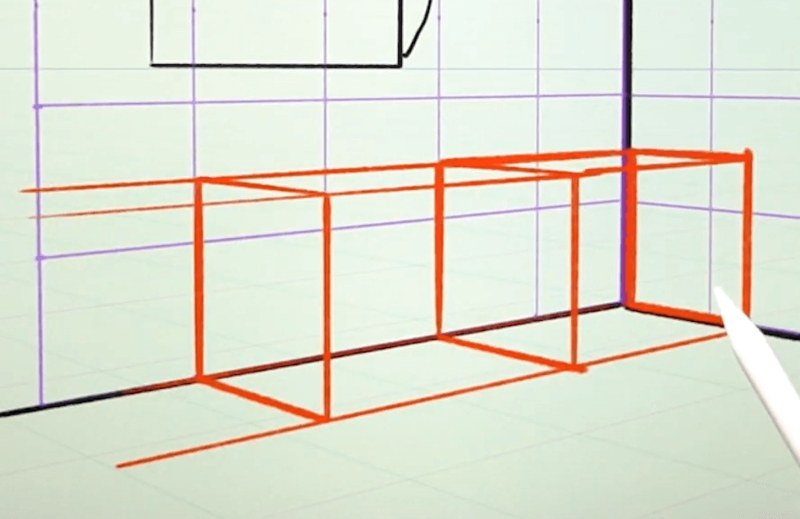 首先,我们以网格的50厘米为基础绘制了一个横向和高度的矩形。延伸上面的横线,从那里拉出30厘米的纵深。
