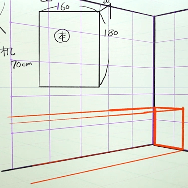 将网格的一格考虑为50厘米,从房间的角落拉出60厘米深,70厘米高,并延伸出横线。这个时候,如果用100厘米分开,就会变成贴在拐角上的桌子。