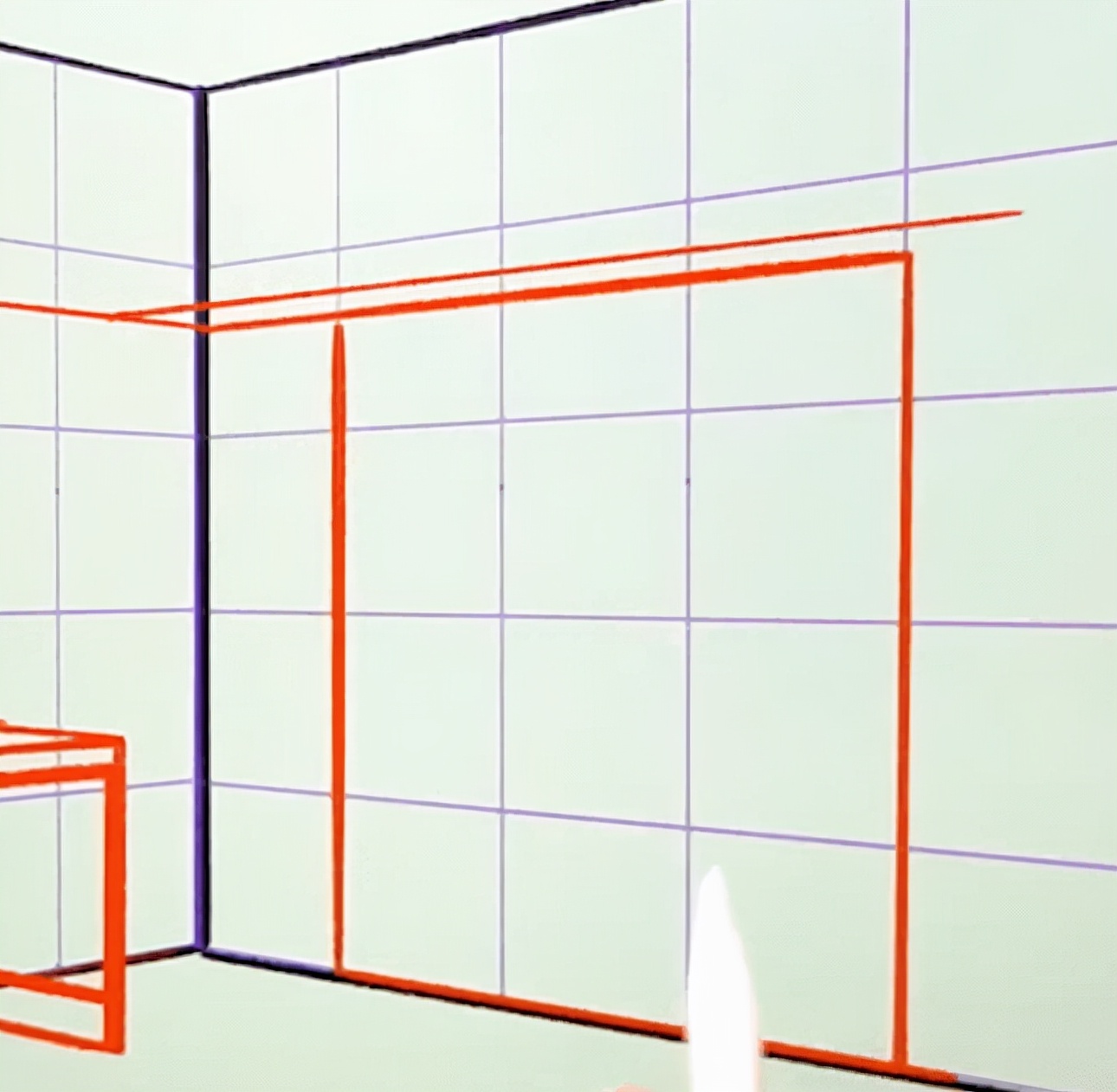 绘制卸下前面墙的两点透视时,将从消失点指向顶点的线延伸并拉出。然后,关掉多余的线就会变成拆下前面墙壁的两点透视的盒子。