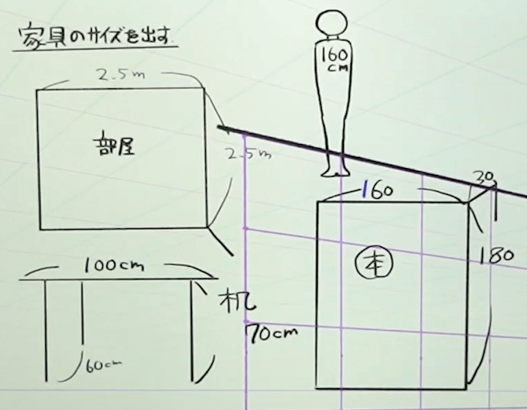 首先决定房间的大小和想配置的东西的大小吧。然后,制作格子状的网格,作为放置家具的基准。