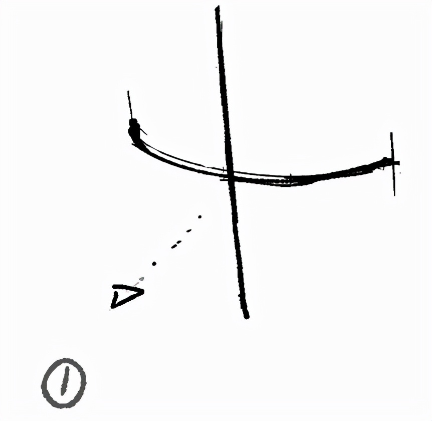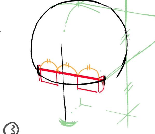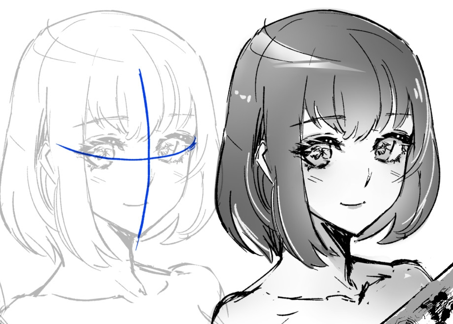 横线曲线的两端大致在脸部边缘。 竖线有决定脸部朝向的意义和到达下巴的向导的作用。下巴最终划了一下,但是直线划得比较好