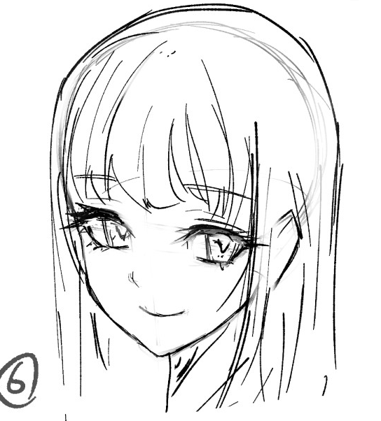 关掉辅助线,画上头发,整理细节。想弄眼角、眼睛下面、下巴的时候请注意。因为基准的线发生了变化,其他的不配合就不行,需要修正的时间会加大!
