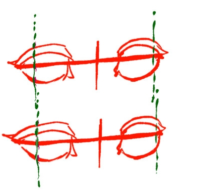 用直线连接第一个横线导轨的两端。这就是眼皮位置的基准。竖线只不过是作为方向的向导,以眼镜一样的形象描绘长方形的眼睛的向导喜欢眼睛的纵向宽度。