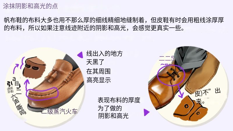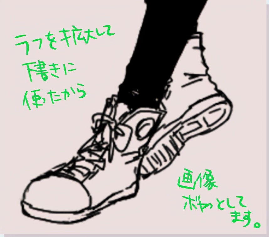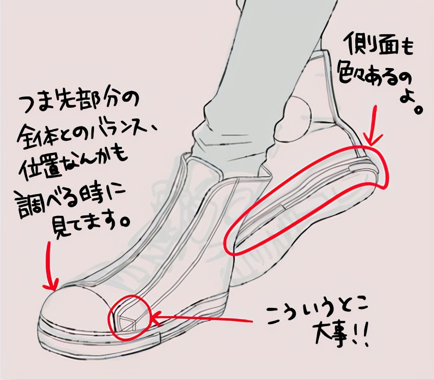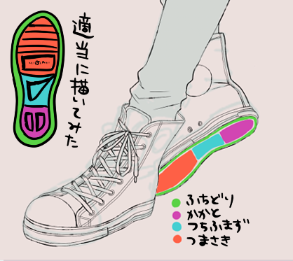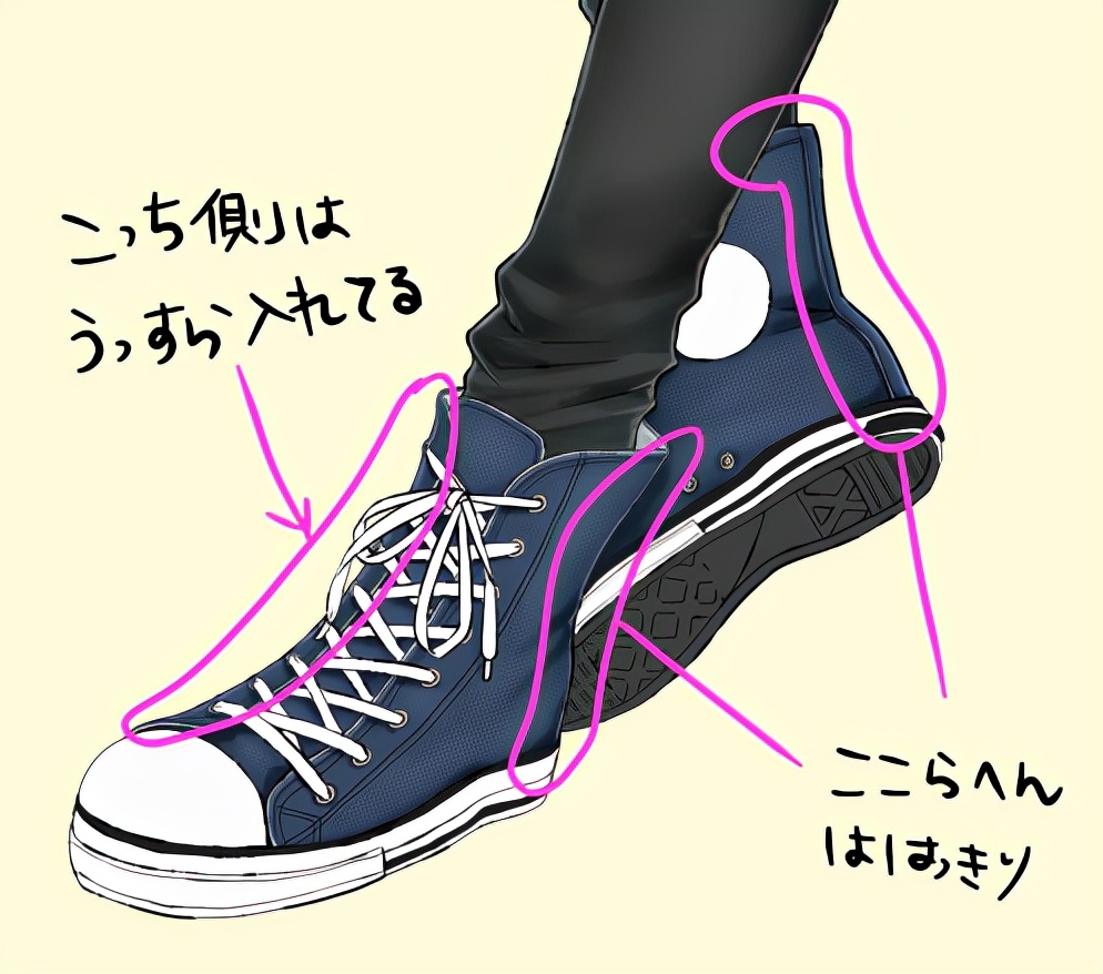 鞋底的花纹也细小地放进去的话会有真实的感觉。在查起来很麻烦的时候就随便画一下,脚后跟、脚尖等处只需稍微转换一下就可以了。