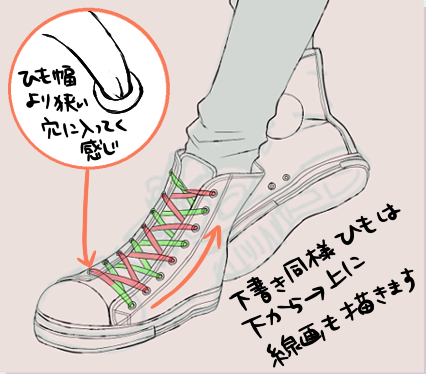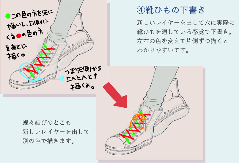 画出新的图层,在洞里用鞋带实际穿过的感觉草稿。改变左右的颜色,一个一个地画的话比较容易理解。