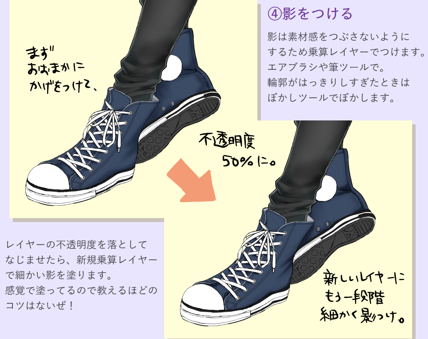 有带子的鞋的情况,暂且无视带子描画鞋的形式。这个时候缝上接缝的话,完成度会大大提高(衣服也是这样的)。