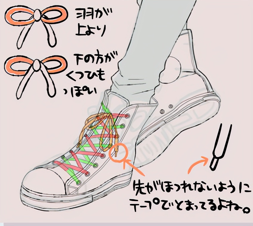 在不同于画鞋形的层上画绳子。像是进入洞内之类的有意识地画出了沿着鞋子外形的曲线。