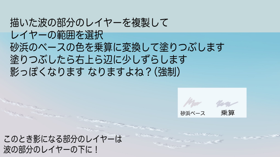 复制绘制的波浪部分的图层,选择图层区域,将沙滩的底色转换为乘法并填充。填充后从右上角稍微向边移动,会有阴影感