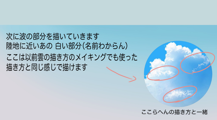 接下来画波浪的部分接近陆地的白色部分。这里和以前画云的方法的画法一样。