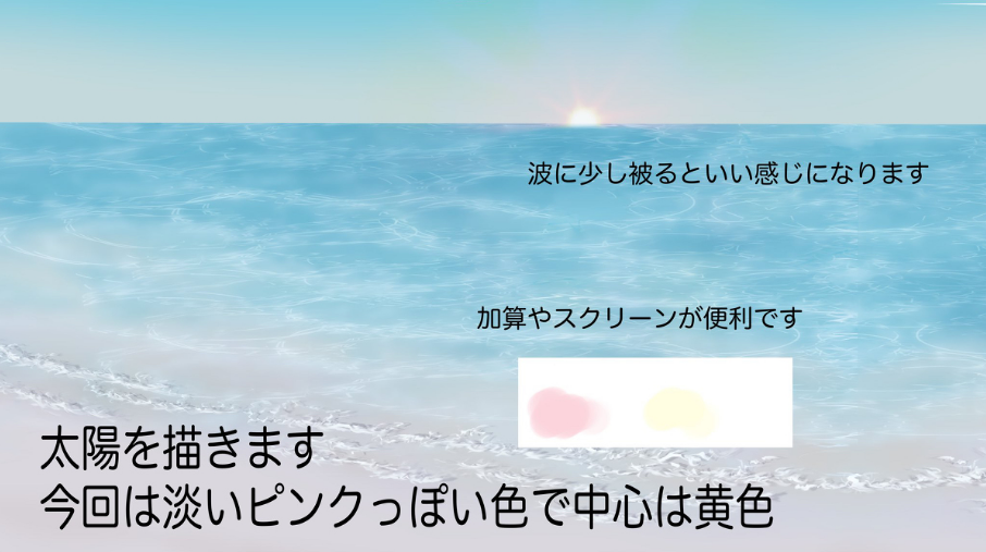 画太阳这次是淡粉红色的颜色,中心是黄色