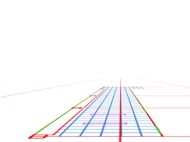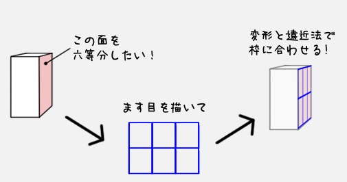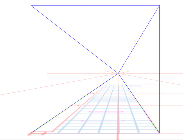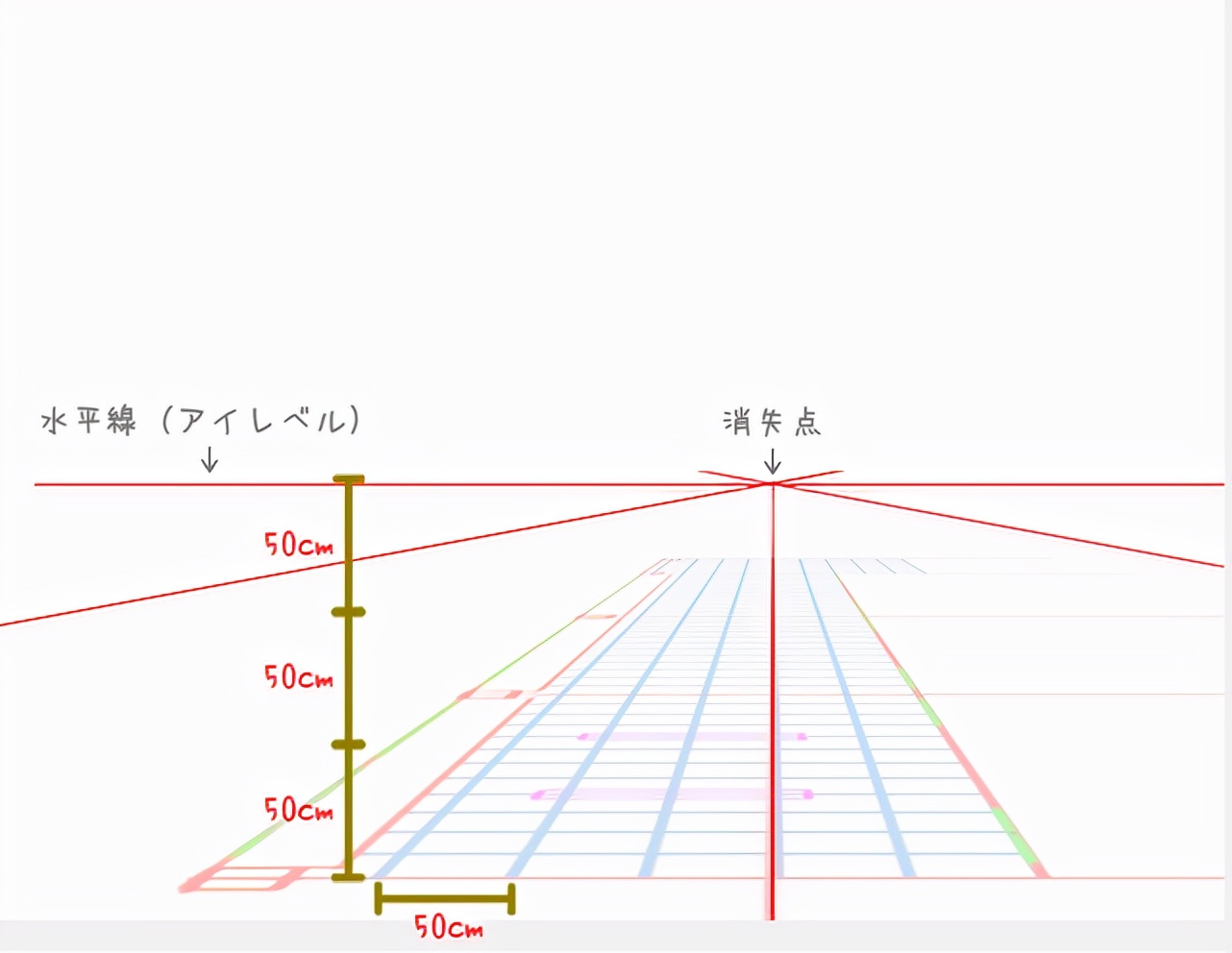 3.延长中心线和辅助线,成为弯曲的地方型消失点。也画水平线。顺便调查一下视线的高度。试着在气的线上维排列一番手前的全部的长度。因为是50cm的设定,所以大概是150cw。如果不喜欢透视的强度和视线的高低,就反复进行2和3项工作,寻找中意的地方吧。
