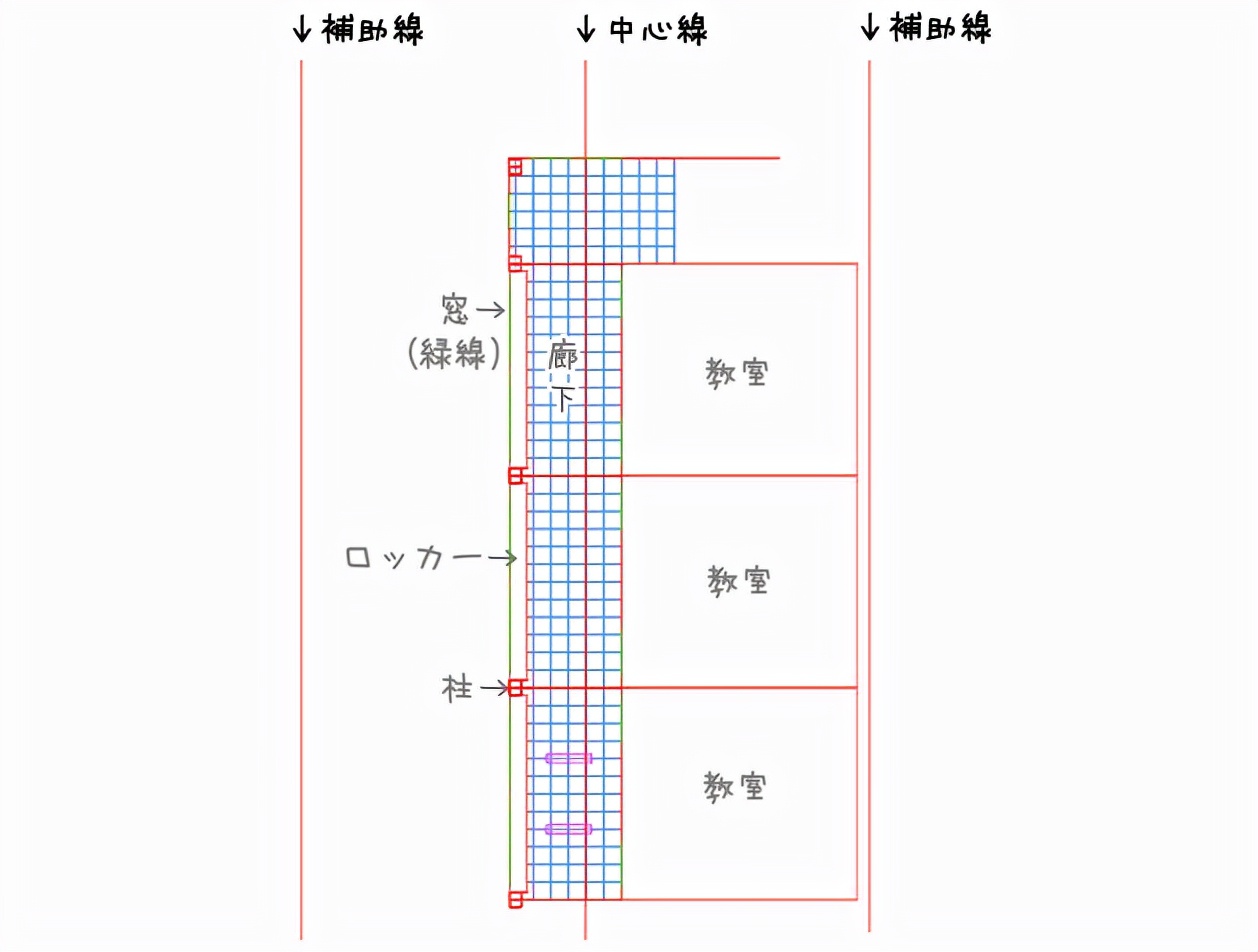 1.首先画平面图。把握空间的大小,蓝线越长的眼睛设定为50厘米。也画窗户、柱子和柜子一个。绘制中心线和辅助线。辅助线相对于中心线对称放置两条。