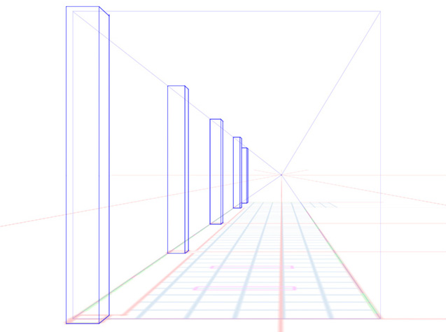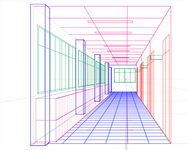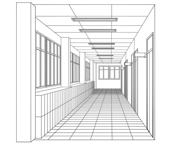4.决定天花板的高度。在这里,由于设定为与走廊的宽度相同的长度,因此沿着跟前的线画出正o形,从4个角到消失点连接线。除此之外的高度时,应用在3中调查吊环的方法,设定为任意高度。后述的家具、门窗等的高度也同样决定。