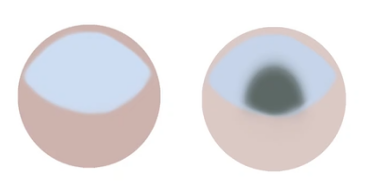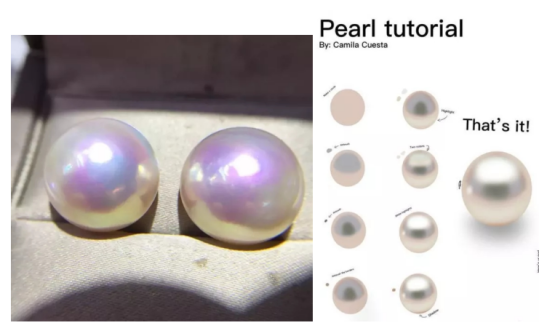 接着再看一下珠光宝气类的,在饰品类也很常见 就是珍珠,珍珠的高光范围会大一些,光滑亮眼,在画的时候可以先填一个中灰色和其他的材质不同, 珍珠的明暗交界线中间位置会有一些暗,底部亮,往上会有一个小半圆形的灰部,可以用灰蓝色表示。