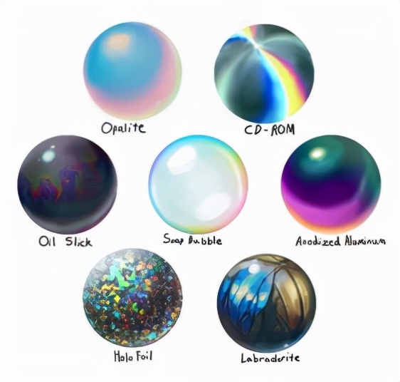 再用浅色去进行一下过渡,大圆的边缘可以用柔边圆 喷上各种浅色色彩的样子,然后用颜色减淡提亮一下受到光照的地方,用白色标识高光的位置,一个简单的镭射材质就完成啦。