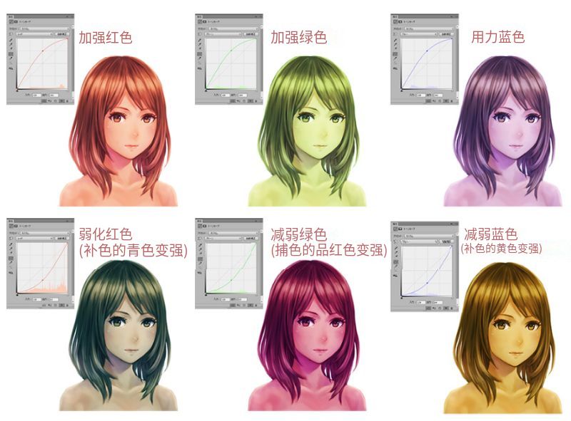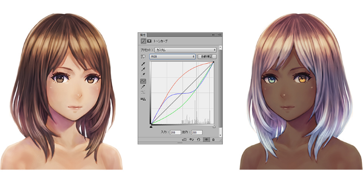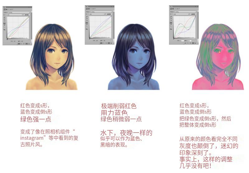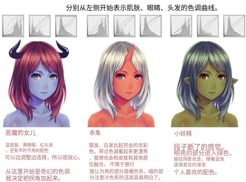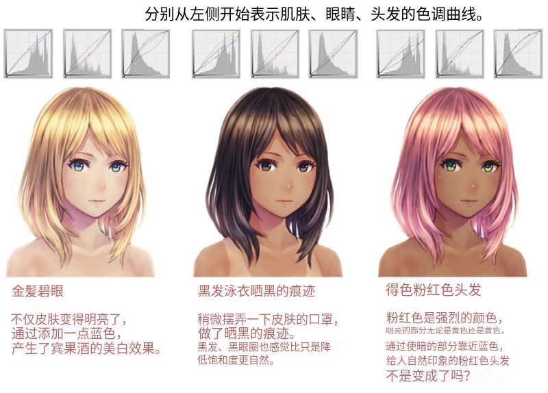分别从左侧开始表示肌肤、眼睛、头发的色调曲线。
