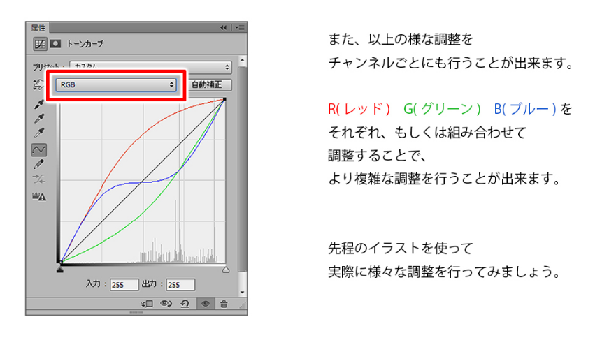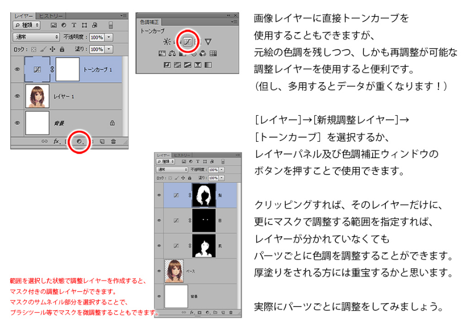 也可以直接在图像图层上使用色调曲线。使用保留原画色调且可重新调整的调整图层非常有用。(但是,如果频繁使用,数据会变重! )