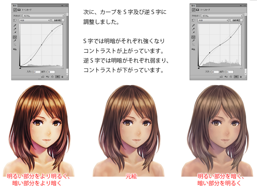 在s字中明暗分别变强,对比度上升。 倒s形明暗分别减弱,对比度下降。