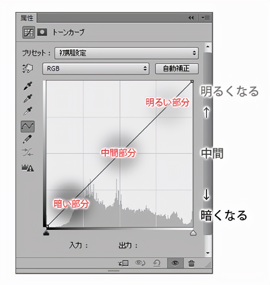 横轴越往右,纵轴越往上越亮。例如,如果移动线中央附近,校正前图像的亮度可以调整中间部分的颜色。